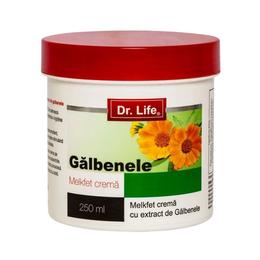 Crema Galbenele Melkfet Dr. Life, 250 ml: remediu natural cu pH neutru si extract de galbenele, cu efect antiinflamator si rol de calmare si reconfortare a pielii uscate si iritate. Are o consistenta cremoasa ce se intinde usor si uniform pe piele, absorbindu-se in scurt timp, fara reziduuri. Hidrateaza intens, ajuta la vindecarea mai rapida a ranilor si imbunatateste regenerarea celulara, fiind adecvata si pentru persoanele cu piele sensibila.