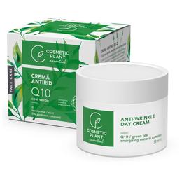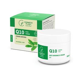Crema Antirid de Zi Q10 + Ceai Verde Cosmetic Plant, 50ml: produs de ingrijire pentru tenul matur normal si mixt, cu o formula imbogatita cu un complex mineral (amestec de calciu, magneziu, cupru si zinc) ce energizeaza si revitalizeaza intens pielea, conferindu-i fermitate si hidratare si prevenind degradarea colagenului si a acidului hialuronic din derma. Contine coenzima Q10, uleiuri naturale din samburi de struguri si germeni de grau, extract de ceai verde si vitaminele A si E ce actioneaza sinergic pentru a regenera tenul si a-l proteja impotriva imbatranirii prin efectul lor antioxidant, oferindu-i elasticitate, hidratare si tonifiere. Filtrele solare previn aparitia ridurilor prin combaterea actiunii nocive a radiatiilor UVA/UVB. Nu contine parabeni sau coloranti.