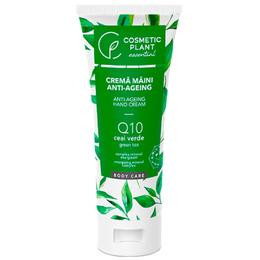 Crema pentru Maini Q10 + Ceai Verde Cosmetic Plant, 100ml: crema cu absorbtie rapida, special conceputa pentru a oferi mainilor ingrijirea zilnica necesara, cu o formula imbogatita cu un complex mineral (amestec de calciu, magneziu, cupru si zinc) ce energizeaza si tonifica pielea, conferindu-i un plus de vitalitate. Contine coenzima Q10, vitamina E si un mix de ingrediente de origine vegetala (unt de cacao, ulei din samburi de struguri si germeni de grau, extract de ceai verde), ce actioneaza sinergic pentru a oferi mainilor hidratare optima si protectie impotriva actiunii nocive a factorilor externi ce cauzeaza imbatranirea cutanata prematura, stimuland regenerarea celulara si mentinand pielea elastica si catifelata. Nu contine parabeni sau coloranti.