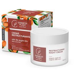 Crema Restructuranta de Noapte Argan Aloe Cosmetic Plant, 50ml: produs de ingrijire pentru tenul normal sau uscat, cu o formula imbogatita cu ingrediente naturale provenite din agricultura organica, ce ofera pielii multiple beneficii. Uleiul de argan bio - sursa de acizi grasi esentiali si vitamine, impreuna cu uleiul din samburi de struguri si untul de cacao, restabilesc stratul lipidic al epidermei si o hranesc in profunzime, asigurand regenerarea si restructurarea acesteia. Extractul bio de aloe vera hidrateaza intens si ajuta la repararea pielii degradate, asigurand epitelizarea si reducand inflamatia, iar complexul de vitamine A, E si B5 ofera pielii protectie, catifelare si nutritie optima. Nu contine parabeni, parafine sau coloranti.