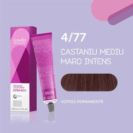 Vopsea Permanenta - Londa Professional Extra Rich Permanent Color, nuanta 4/77 Castaniu Mediu Maro Intens, 60 ml: asigura o acoperire a firelor albe de pana la 100%. Contine tehnologia cu microsfere Vitaflection ce ofera hranire si extra-stralucire, pentru rezultate de lunga durata, culori vibrante, colorare ton pe ton, precum si inchidere sau deschidere cu pana la 5 trepte.