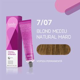 Vopsea Permanenta - Londa Professional Extra Rich Permanent Color, Nuanta 7/07 Blond Mediu Natural Maro, 60 ml: asigura o acoperire a firelor albe de pana la 100%. Contine tehnologia cu microsfere Vitaflection ce ofera hranire si extra-stralucire, pentru rezultate de lunga durata, culori vibrante, colorare ton pe ton, precum si inchidere sau deschidere cu pana la 5 trepte.