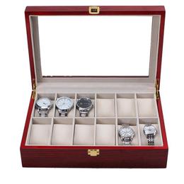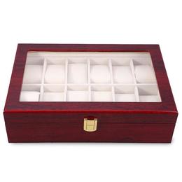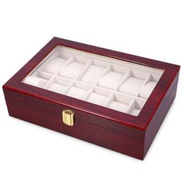 Cutia pentru 12 ceasuri are un design extrem de elegant, exteriorul este din lemn lacuit de culoarea ciresului, iar interiorul este invelit intr-un material de catifea de calitate superioara care denota eleganta.