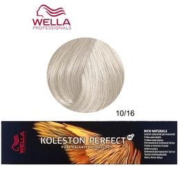 Vopsea Crema Permanenta - Wella Professionals Koleston Perfect ME+ Rich Naturals, nuanta 10/16 Blond Luminos Deschis Cenusiu Violet: vopsea profesionala cu o textura cremoasa, usor de amestecat si de aplicat pe intreaga lungime a parului, ce ofera o gama larga de nuante intense, vibrante si pline de profunzime pentru a permite obtinerea unor culori pure, uniforme, stralucitoare si rezistente in timp. Formula sa optimizata asigura acoperirea completa a firelor albe, in timp ce tehnologia Pure Balance previne formarea radicalilor liberi in timpul procesului de colorare, minimizand astfel deteriorarea firului de par. Datorita consistentei sale lejere, vopseaua se indeparteaza usor si rapid din par prin clatire si confera parului un aspect neted, matasos, plin de vitalitate si luciu natural.