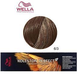 Vopsea Crema Permanenta - Wella Professionals Koleston Perfect ME+ Rich Naturals, nuanta 6/3 Blond Inchis Auriu: vopsea profesionala cu o textura cremoasa, usor de amestecat si de aplicat pe intreaga lungime a parului, ce ofera o gama larga de nuante intense, vibrante si pline de profunzime pentru a permite obtinerea unor culori pure, uniforme, stralucitoare si rezistente in timp. Formula sa optimizata asigura acoperirea completa a firelor albe, in timp ce tehnologia Pure Balance previne formarea radicalilor liberi in timpul procesului de colorare, minimizand astfel deteriorarea firului de par. Datorita consistentei sale lejere, vopseaua se indeparteaza usor si rapid din par prin clatire si confera parului un aspect neted, matasos, plin de vitalitate si luciu natural.