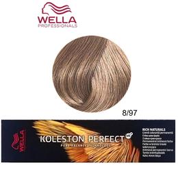 Vopsea Crema Permanenta - Wella Professionals Koleston Perfect ME+ Rich Naturals, nuanta 8/97 Blond Deschis Albastru Maro: vopsea profesionala cu o textura cremoasa, usor de amestecat si de aplicat pe intreaga lungime a parului, ce ofera o gama larga de nuante intense, vibrante si pline de profunzime pentru a permite obtinerea unor culori pure, uniforme, stralucitoare si rezistente in timp. Formula sa optimizata asigura acoperirea completa a firelor albe, in timp ce tehnologia Pure Balance previne formarea radicalilor liberi in timpul procesului de colorare, minimizand astfel deteriorarea firului de par. Datorita consistentei sale lejere, vopseaua se indeparteaza usor si rapid din par prin clatire si confera parului un aspect neted, matasos, plin de vitalitate si luciu natural.