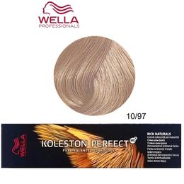 Vopsea Crema Permanenta - Wella Professionals Koleston Perfect ME+ Rich Naturals, nuanta 10/97 Blond Luminos Deschis Albastru Maro: vopsea profesionala cu o textura cremoasa, usor de amestecat si de aplicat pe intreaga lungime a parului, ce ofera o gama larga de nuante intense, vibrante si pline de profunzime pentru a permite obtinerea unor culori pure, uniforme, stralucitoare si rezistente in timp. Formula sa optimizata asigura acoperirea completa a firelor albe, in timp ce tehnologia Pure Balance previne formarea radicalilor liberi in timpul procesului de colorare, minimizand astfel deteriorarea firului de par. Datorita consistentei sale lejere, vopseaua se indeparteaza usor si rapid din par prin clatire si confera parului un aspect neted, matasos, plin de vitalitate si luciu natural.