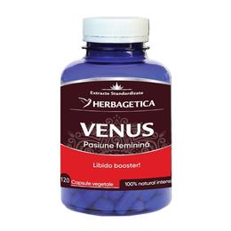 Venus Herbagetica, 120 capsule vegetale: supliment alimentar creat special pentru femei, care contribuie la cresterea libidoului pe perioada indelungata si constanta prin refacerea echilibrului psiho-emotional si hormonal. Este eficient in imbunatatirea starii afective si reducerea depresiei, accelereaza recuperarea dupa munca grea, regleaza ciclul menstrual, stimuleaza capacitatea de adaptare a organismului la stresul metabolic si cel psihic, imbunatateste functiile sistemului nervos, creste performantele intregului organism si capacitatea de reactie a acestuia.