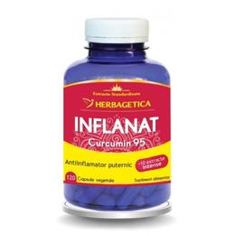 Inflanat Curcumin 95 Herbagetica, 120 capsule vegetale: supliment alimentar natural, formulat cu 10 extracte vegetale, conceput pentru a sustine sanatatea sistemului osteo-articular si a reduce inflamatiile din organism. Contine Curcumin95 C3 complex, boswellia serrata, acerola, salvie, cimbru, cuisoare, salcie alba, ghimbir, lemn-dulce si piper negru, ingrediente cunoscute pentru proprietatile lor antiinflamatoare si antioxidante.