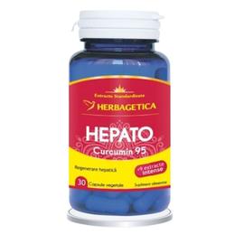 Hepato Curcumin95 - Herbagetica, 30 capsule: supliment alimentar ce contine o formula complexa cu 9 extracte naturale, conceput pentru a sustine sanatatea ficatului. Asocierea de Curcumin95 C3 Complex cu silimarina si silibina extrase din armurariu, schizandra, anghinare, cicoare, brusture, aunatoare, lemn dulce si piper negru poate contribui la eliminarea toxinelor din ficat si la protejarea acestuia.