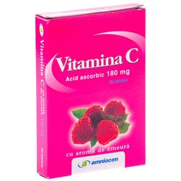 Vitamina C 180 mg cu Aroma de Zmeura - Amniocen, 20 tablete: Vitamina C contribuie la functionarea normala a sistemului imunitar, la protejarea celulelor impotriva stresului oxidativ, la formarea normala a colagenului pentru functionarea normala a vaselor de sange, a sistemului osos, a ligamentelor, a dintilor si a gingiilor. Contribuie la metabolismul energetic normal si la reducerea oboselii si extenuarii.