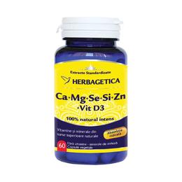 CA+MG+SE+SI+ZN Organice CU D3 Herbagetica, 30 capsule: supliment alimentar ce contine minerale si vitamine 100% naturale ce contribuie la reducerea infectiilor virale si bacteriene. Ajuta la functionarea normala a sistemelor imunitar, muscular si nervos, reducerea oboselii si extenuarii. protejarea celulelor impotriva stresului oxidativ, cresterea imunitatii, mentinerea sanatatii psihice si procesul de diviziune celulara.