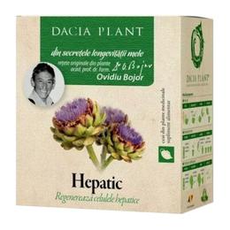 Ceai Hepatic Dacia Plant, 50g: este un produs natural ce sustine cu eficacitate functiile hepatice. Ajuta la mentinerea concentratiei normale a colesterolului si grasimilor in sange. Este eficient in protejarea si regenerarea celulelor hepatice, prin indepartarea compusilor toxici din ficat. Ajuta la o digestie corespunzatoare si elimina spasmele ce apar la nivelul cailor biliare si tractului intestinal. Nu este recomandata folosirea lui in sarcina, alaptare sau alergie la oricare dintre componentele produsului.