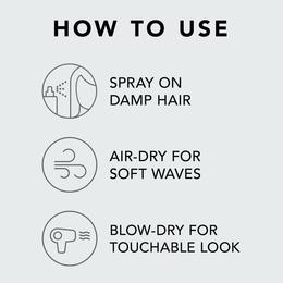 Aplicare: pulverizati pe parul umed. Lasati sa se usuce natural pentru bucle lejere sau uscati cu foehnul pentru un look matasos si flexibil. Puteti folosi ondulatorul pentru a crea bucle definite. Pulverizati si pe parcursul zilei, pentru reimprospatarea coafurii.