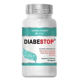 Diabestop Cosmo Pharm, 30 capsule: este un supliment alimentar ce scade glicemia si toleranta la dulce. Ajuta la reducerea sau inlaturarea complicatiilor cauzate de diabet, cum ar fi hipertensiunea arteriala, accidentul vascular cerebral, depresie sau tulburari cognitive si de memorie. Regenereaza cu succes celulele pancreatice si le protejeaza impotriva stresului oxidativ.