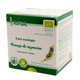 Ceai Ecologic Frunze de Rozmarin - Hofigal, 25 plicuri: ceai obtinut din plante cultivate conform normelor agriculturii ecologice. Frunzele de rozmarin sunt recunoscute pentru continutul ridicat de uleiuri volatile (camfen, borneol), acid rozmarinic, flavonozide, triterpene, saponine, taninuri si vitamina C. Aceste componente confera ceaiului proprietati tonic-amare, colagog-coleretice, hepatoprotectoare, vasoprotectoare si antioxidante. Este utilizat pentru sustinerea sanatatii sistemului digestiv, hepatic si a circulatiei periferice.