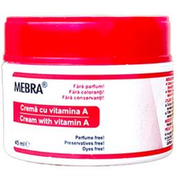 Crema cu Vitamina A Mebra, 45ml (Cutie): crema cu vitamina A, ce imbunatateste aspectul si textura pielii. Este ideala pentru intretinerea tegumentelor uscate. De asemenea, contribuie la o buna epitelizare si la mentinerea elasticitatii epidermei.