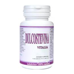 Dulcostevina Pulbere Vitalia Pharma, 25 g: produs recomandat ca inlocuitor al zaharului, benefic in curele de slabire, reducand in mod natural apetitul pentru dulciuri. De asemenea, ajuta la eliminarea surplusului de apa din tesuturi. Poate fi folosit cu succes de catre persoanele care sufera de obezitate sau care vor sa-si mentina greutatea in limitele normale, deoarece aduce 0 calorii in organism.