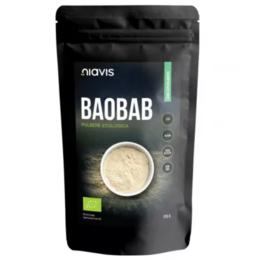 Baobab Pulbere Ecologica Niavis, 125g: baobabul, denumit si Copacul vietii, este recunoscut si utilizat in medicina ayurvedica datorita fructului sau cu un continut complex de nutrienti, considerat un superaliment. Pudra obtinuta din fructul de baobab este mai bogat in vitamina C decat portocalele, contine mai mult fier decat carnea rosie si este o sursa importanta de minerale alcaline (calciu, potasiu, magneziu). Nu contine alergeni.