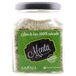 Sare de Baie cu Menta Savonia, 350g: produs de ingrijire corporala pe baza de sare naturala din salina Praid, bogata in minerale precum sodiu, calciu, potasiu, magneziu etc, ce relaxeaza musculatura si lasa pielea proaspata si catifelata, fiind de asemenea benefica pentru sistemul nervos. Menta, sub forma de frunze uscate si ulei esential, are efect purifiant si racoritor, elimina senzatia de oboseala din organism si decongestioneaza caile respiratorii, conferind produsului o aroma revigoranta.