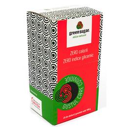 Green Sugar Remedia, 4g x 25 buc: indulcitor 100% natural cu zero calorii si zero indice gliemic. Este recomandat in cure de slabire sau persoanelor ce sufera de diabet, deoarece nu are zahar adaugat. Se poate uriliza pentru indulcirea bauturilor calde sau reci. Este stabil la coacere, fierbere si congelare, avand valoare energetica zero si putere de indulcire egala cu cea a zaharului. Produsul nu contine gluten, coloranti, conservanti si ingrediente sintetice.