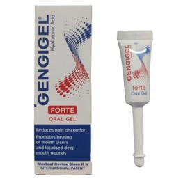 Gel Oral Gengigel Forte, 8 ml: gel oral cu o concentratie ridicata de acid hialuronic (0.8%), obtinut dintr-o sursa de calitate superioara ce asigura o puritate crescuta a acestuia, avand o actiune locala de lunga durata. Este indicat in cazul ulceratiilor bucale, al aftelor si al leziunilor mai profunde, accelerand procesul de vindecare si atenuand senzatia de durere inca de la prima aplicare. Adera la mucoasa gingivala pentru a permite acidului hialuronic sa se mentina la suprafata acesteia pentru mai mult timp si a asigura regenerarea tesuturilor. Se poate utiliza fara restrictii de toti pacientii (copii, femei insarcinate, batrani, diabetici etc). Tubul cu canula faciliteaza aplicarea.