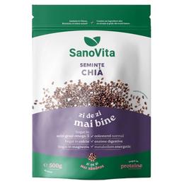 Seminte de Chia - SanoVita Zipper, 500 g: semintele de chia sunt o sursa bogata de fibre, proteine, acizi grasi esentiali Omega 3 si 6, antioxidanti, minerale, vitamine si aminoacizi, oferind organismului numeroase beneficii. Inhiba pofta de mancare, fiind utile in curele de slabire si de mentinere a greutatii corporale, energizeaza organismul, previn imbatranirea prematura si sunt indicate pentru alimentatia diabeticilor, avand un indice glicemic scazut. Continutul ridicat de calciu sustine sanatatea oaselor, a muschilor si a sistemului nervos, fosforul sprijina sistemul imunitar, seleniul si ceilalti antioxidanti din compozitie (quercitina, acidul cafeic si clorogenic, kaempferolul) combat actiunea nociva a radicalilor liberi, fierul are rol in formarea hemoglobinei iar magneziul este esential pentru dezvoltarea musculaturii si functionarea optima a sistemului nervos. Se pot include cu usurinta in alimentatie, incorporate in diverse preparate (budinci, salate, sosuri etc).