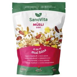 Musli cu Goji - SanoVita Zipper, 400 g: amestec echilibrat de fulgi de cereale, stafide, seminte de floarea-soarelui si fructe goji, cu un continut ridicat de vitamine, minerale, proteine, antioxidanti si fibre, ideali pentru o alimentatie sanatoasa. Fructele goji contin 18 aminoacizi (din care 8 aminoacizi esentiali), iar strugurii deshidratati de Corint adauga produsului un gust si o aroma deosebite. Ofera organismului nutrientii necesari si un plus de energie.
