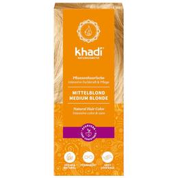 Vopsea de Par Henna pentru Blond Mediu - Khadi Medium Blonde Natural Hair Color, 100 g: vopsea de par naturala pe baza de henna si plante ayurvedice naturale pentru vopsirea parului in nuante de blond mediu (miere). Este ideala pentru persoanele cu piele sensibila si alergice la chimicalele din vopselele de par conventionale. Confera parului alb nuante de blond, care pot varia de la blond mediu la un blond mediu rosiatic, in functie de timpul de actionare al vopselei. In functie de nuanta de blond pe care se aplica, vopseaua poate inchide putin culoarea. Confera parului luminozitate. Aplicata pe parul inchis la culoare nu va schimba culoarea, ci va oferi parului stralucire si volum.