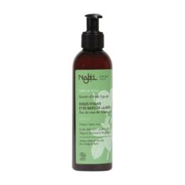 Sapun de Alep Lichid cu Trandafir de Damasc Najel, 200 ml: sapun de Alep in forma lichida, combinat cu proprietatile purificatoare ale apei florale de trandafiri de Damasc. Are efect calmant, fiind un sapun ideal pentru igiena zilnica a pielii. Este un tratament de ingrijire pentru toate tipurile de piele, in special pentru cea uscata si sensibila. Sapunul de Alep lasa pielea moale si protejata de iritatii. De asemenea, acest produs este fabricat exclusiv din uleiuri de plante, nu face spuma, deoarece nu contine niciun agent sintetic de spumare.