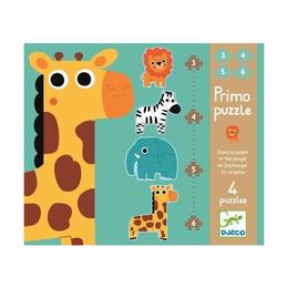 Conține 4 puzzle-uri: leuţ - 3 piese, zebră - 4 piese, girafă - 5 piese, elefant - 6 piese.