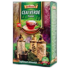 Ceai Verde Frunze AdNatura, 50 g: ceaiul verde este un bun antioxidant, diuretic si stimulator cerebral. Stimuleaza procesele de ardere a grasimilor si ofera un factor de protectie anticancer. Ajuta la buna functionare a aparatului cardiovascular si intarzie semnele imbatranirii. De asemenea, acest produs este un stimulent intelectual si fizic, putand fi folosit si in cadrul curelor de slabire. Sustine mentinerea greutatii corporale normale si buna functionare a sistemului digestiv. Protejeaza impotriva stresului oxidativ, ajutand la scaderea colesterolului si trigliceridelor in sange. Se foloseste ca adjuvant in cure de slabire, obezitate, greutate in exces si stopeaza aparitia cariilor dentare.