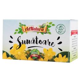 Ceai de Sunatoare AdNatura, 20 buc: ceai cu excelente proprietati relaxante si antidepresive, recomandat in starile de neliniste si tensiune nervoasa pentru a reduce anxietatea, frica si oboseala psihica si a imbunatati starea generala si rezistenta la stres. Este adjuvant in insomnii si tulburari de memorie, precum si in diverse afectiuni hepatice, gastrice, digestive (colecistite, hepatite, ulcer, enterocolite, colite cronice etc). De asemenea, acest produs sustine sanatatea tractului urinar inferior si starea psihologica echilibrata.