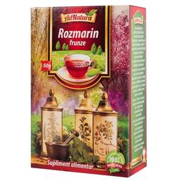 Ceai de Rozmarin AdNatura, 50g: ceaiul de rozmarin sustine buna functionare a sistemului digestiv, asigurand confortul la nivelul acestuia si revigorarea organismului. Sustine digestia, functionarea optima a ficatului, stomacului, intestinelor si rinichilor, reduce disconfortul abdominal, articular si muscular, combate balonarile si flatulenta, stimuleaza secretia si eliminarea bilei in duoden, sustine pofta de mancare, mentine sanatatea articulatiilor si o buna circulatie sanguina periferica, tonifica organismul in stari de surmenaj fizic si intelectual, relaxeaza musculatura si are proprietati antioxidante.