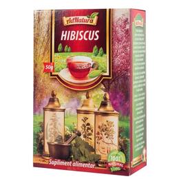Ceai Hibiscus AdNatura, 50g: este indicat persoanelor cu probleme cardiovasculare. Este un produs ce reduce considerabil riscul de a se produce un infarct, mentinand tensiunea arteriala in limite normale. De asemenea, ajuta la eliminarea lichidelor ce sunt in exces in organismul uman, dand o stare de confort si favorizand pierderea in greutate sau detoxifierea. Mentine si sanatatea aparatului respirator si a parului. Are rol antioxidant, fiind un excelent aparator al celulelor impotriva stresului oxidativ.