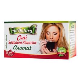 Ceai Savoarea Plantelor Aromat AdNatura, 20 buc: produs natural ce contine un amestec omogen in proportii variabile din hibiscus, flori de macese, fructe de coriandru, frunze de stevie dulce, fructe de aronia, fructe de fenicul si mere. Sustine completarea necesarului de vitamine, minerale si antioxidanti necesari neutralizarii radicalilor liberi. Previne afectiunile declansate de acestia si mentine starea de bine a organismului. De asemenea, acest produs este benefic pentru ameliorarea starilor de oboseala si anxietate.