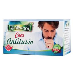 Ceai Antitusiv AdNatura, 20 buc: produs natural ce contine un amestec omogen in proportii variabile din frunze de patlagina, frunze de busuioc, cimbrisor, ceai verde, frunze si flori de paducel, flori de soc. Calmeaza tusea si durerile in gat ce insotesc starile de gripa si raceala.