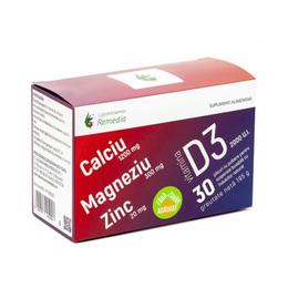 Ca + Mg + Zn + Vitamina D3 Remedia, 30 plicuri: supliment alimentar ce asigura o rezistenta sporita organismului in conditii de stres, suprasolicitare fizica sau mentala. Creste capacitatea de rezistenta a organismului la actiunea factorilor patogeni.