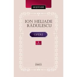Primul volum include operele de referinţă ale poetului (prefaţate, selectate şi comentate de Mircea Anghelescu, cel mai avizat cunoscător al operei lui Heliade Rădulescu): creaţia poetică cuprinsă în cărţile Meditaţii poetice dintr-ale iui A. de Lamartine (1830) şi Culegere din scrierile lui I. Eliad de proză şi de poezie (1836), o serie de texte poetice culese din periodice, din manuscrise şi din alte volume, selecţiuni din paginile în proză, distribuite respectiv în cuvântări şi conferinţe, schiţe, fiziologii, satire şi texte de critică literară; câteva dintre textele de teatru ale autorului, care a avut o contribuţie esenţială la formarea Teatrului Naţional.
