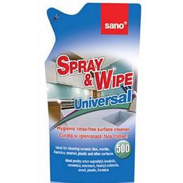 Rezerva Solutie pentru Curatare Universala – Sano Universal Spray & Wipe Refill, 500 ml: curata si degreseaza orice tip de suprafata fara a fi necesara clatirea. Solutia este ideala pentru cuptoare, dulapuri de bucatarie, mese, chiuvete, mobilier si jaluzele din plastic sau formica, suprafete din ceramica, robinete, rame de ferestre sau fotografii, obloane din plastic etc. Este eficienta si foarte usor de folosit.