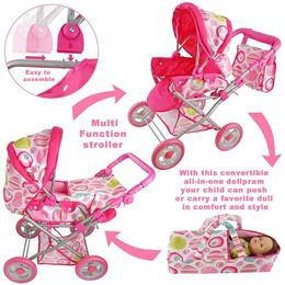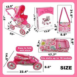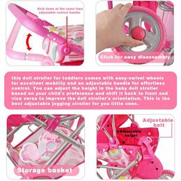 - Caruciorul pentru papusi este prevazut cu cos de cumparaturi, landou, geanta pentru scutece si copertina de soare,centura de siguranta.