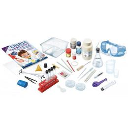 Contine: bicarbonat de sodiu (40 g), glicerina diluata (20 g), ipsos de Paris (100 g), gelatina (5 g), colorant rosu (3 g), pahar mic (20 ml), pahar mare (150 ml), penseta , lingura de masurat, agitator, palnie, 10 fire de cablu, argila de modelat, 20 de hartie de pH, scara de pH, lupa, pipeta, magnet, termometru, fir de bumbac, seringa, 4 eprubete si 4 dopuri, suport pentru eprubete, perie pentru sticle, 2 vase Petri, recipient mare, balon, dop perforat, dop solid, balon, hartii de filtru, 2 paie, ochelari de protectie, fisa de instructiuni colorata.