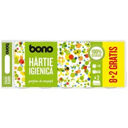 Hartie Igienica cu Parfum de Musetel 3 Straturi Bono, 8 role+2 Gratis: hartie igienica din celuloza 100%, fina si delicata, cu parfum de musetel. Pachetul contine 10 role cu 3 straturi, lungimea unei role fiind de 20 m.
