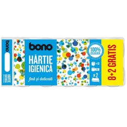 Hartie Igienica 2 Straturi Bono, 8 role+2 Gratis: hartie igienica din celuloza, fina si delicata. Nu sunt parfumate. Pachetul contine 10 role cu 2 straturi, lungimea unei role fiind de 20 m.