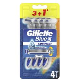 Aparat de Ras cu 3 Lame - Gillette Blue 3 Comfort, 4 buc: aparat de ras cu 3 lame ce se ajusteaza automat conturului fetei. Asigura un plus de confort in timpul barbieritului datorita benzii lubrifiante ce garanteaza o alunecare fina. Lamele montate pe arcuri se ajusteaza formei fetei, oferind un ras precis, iar apa trece printre acestea, asigurand o clatire superioara, in comparatie cu aparatele cu 2 lame. De asemenea, manerul dispune de un invelis de elastomer, care nu aluneca nici macar cand este ud.