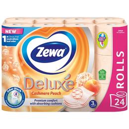 Hartie Igienica cu Parfum de Piersica 3 Straturi - Zewa Deluxe Cashmere Peach, 24 role: hartie igienica parfumata cu parfum de piersica. Hartia igienica este de o calitate superioara, cu 3 straturi, foarte rezistenta si absorbanta, pentru o senzatie de curatenie si incredere. Este creata din fibre de origine naturala, si este fina ca matasea. Este testata dermatologic, pentru a minimiza iritatiile pielii sensibile. In plus, tubul AquaTube, este reciclabil si biodegradabil, foarte usor de aruncat, chiar la toaleta dupa terminarea hartiei.