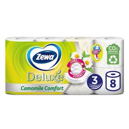 Hartie Igienica cu Parfum de Musetel 3 Straturi - Zewa Deluxe Camomile Comfort, 8 role: hartie igienica parfumata cu parfum de musetel. Hartia igienica este de o calitate superioara, cu 3 straturi, foarte rezistenta si absorbanta, pentru o senzatie de curatenie si incredere. Este creata din fibre de origine naturala, si este fina ca matasea. Este testata dermatologic, pentru a minimiza iritatiile pielii sensibile. In plus, tubul este reciclabil si biodegradabil, foarte usor de aruncat, chiar la toaleta dupa terminarea hartiei.