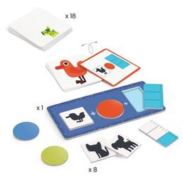 Copiii aleg o carte patrata "animal", una rotunda "culoare" si una dreptunghiulara "dimensiune" (mica sau mare). Apoi gasesc cardul care corespunde acestor 3 criterii.