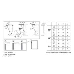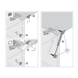 Fiecare piston vine echipat cu o placa de fixare pe laterala dulapului, o placuta pentru fixare pe usa din PAL/lemn/MDF, o placa pentru fixare pe usa din profile de aluminiu (cu latimea maxima de 25 mm) si 5 suruburi pentru lemn cu diametrul de 3.5 si lungimea de 14 mm.