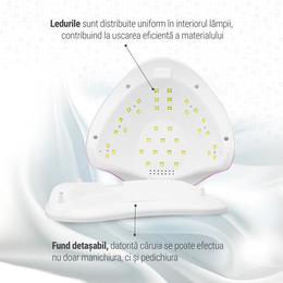 Lampa are un fund detasabil, ceea ce faciliteaza efectuarea pedichiurii si un comfort mai mare de utilizare. Produsul poate fi utilizat atat pentru manichiura, cat si pentru pedichiura. Aparatul nu produce senzatia de arsura in timpul manichiurii.